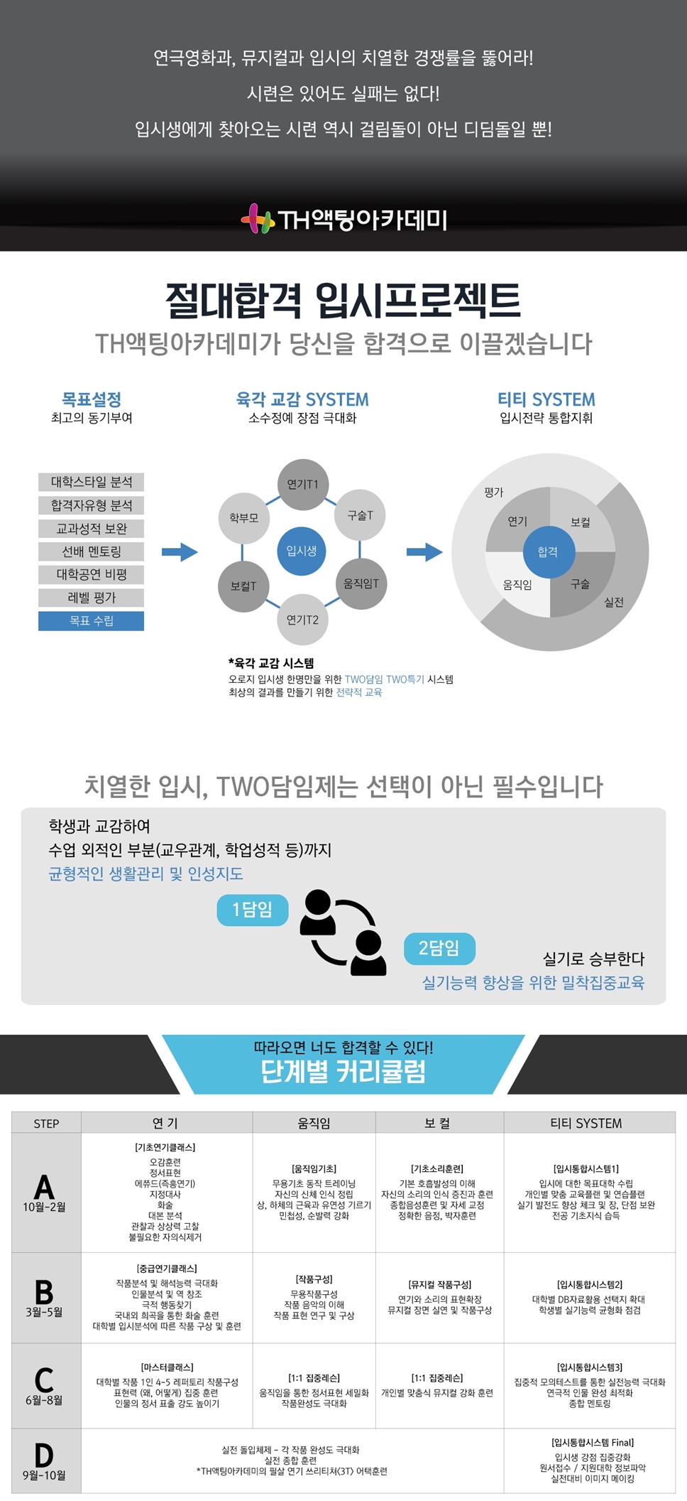 그래서 TH액팅아카데미는 무엇보다 배우로서의 기본과 기초를 중시하며, 스스로 단단해지며 긴 터널을 빠져나올 수 있는 방법을 터득할 수 있도록 교육합니다.