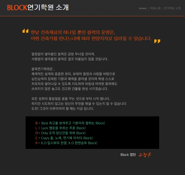 한낱 건축재료의 하나일 뿐인 블록의 운명은, 어떤 건축가를 만나느냐에 따라 천양지차로 달라질 수 있습니다. 체계적인 설계와 꼼꼼한 관리, 보태어 열정과 사랑을 바탕으로 십인십색의 잠재된 기량과 매력을 끌어낼 것이며 학생 스스로 차곡차곡 쌓아 나갈 수 있도록 지도합니다.