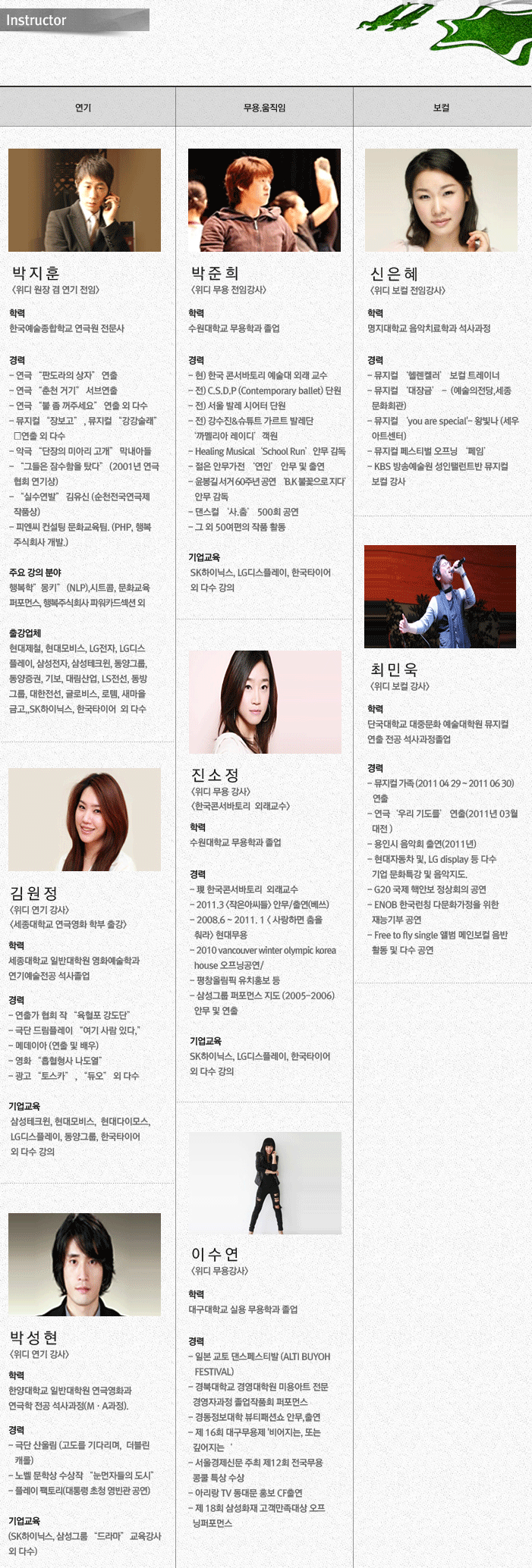 | 특기수업 | 뮤지컬, 마임, 아크로바틱, 발레, 현대무용, 째즈, 방송댄스 |