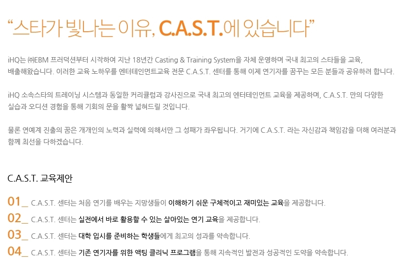 국내 최고의 톱스타들을 양성해온 iHQ(싸이더스HQ)가 지난 20년간의 스타교육 노하우를 살려 운영하는 전문 연기트레이닝 센터.