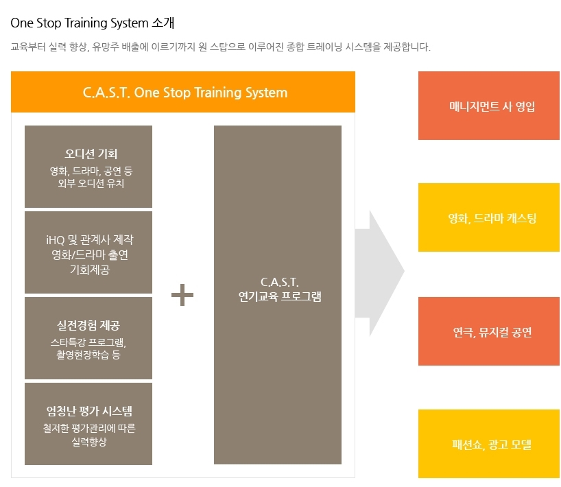 캐스트 연기학원은 싸이더스HQ 소속 스타와 동일한 커리큘럼과 강사진으로 전문적이고 수준 높은 연기교육을 제공하며, 다양한 오디션 기회를 통해 스타로 발돋움 할 수 있는 체계적인 One Stop Training System을 갖추고 있습니다.