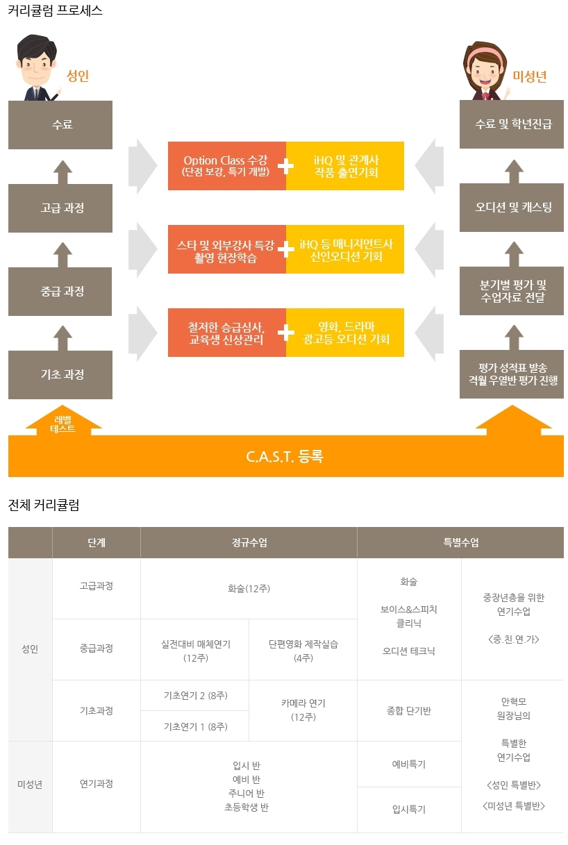 -기초과정(기초연기, 카메라연기) 중급과정(실전매체연기, 단편영화제작) 고급과정(고급화술)