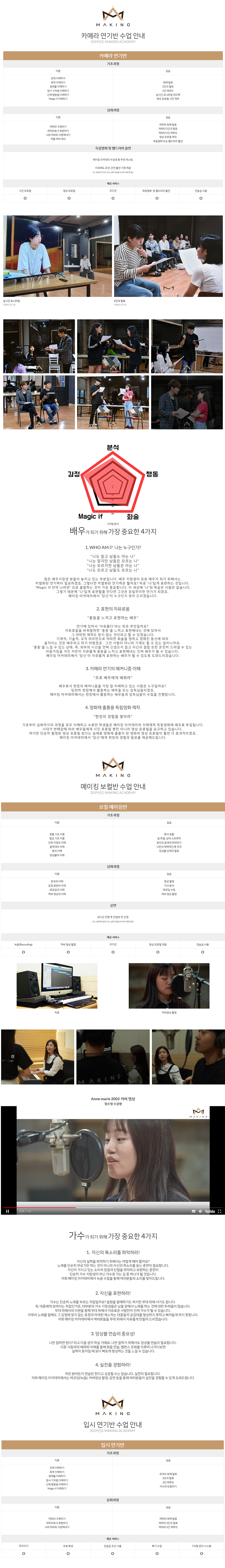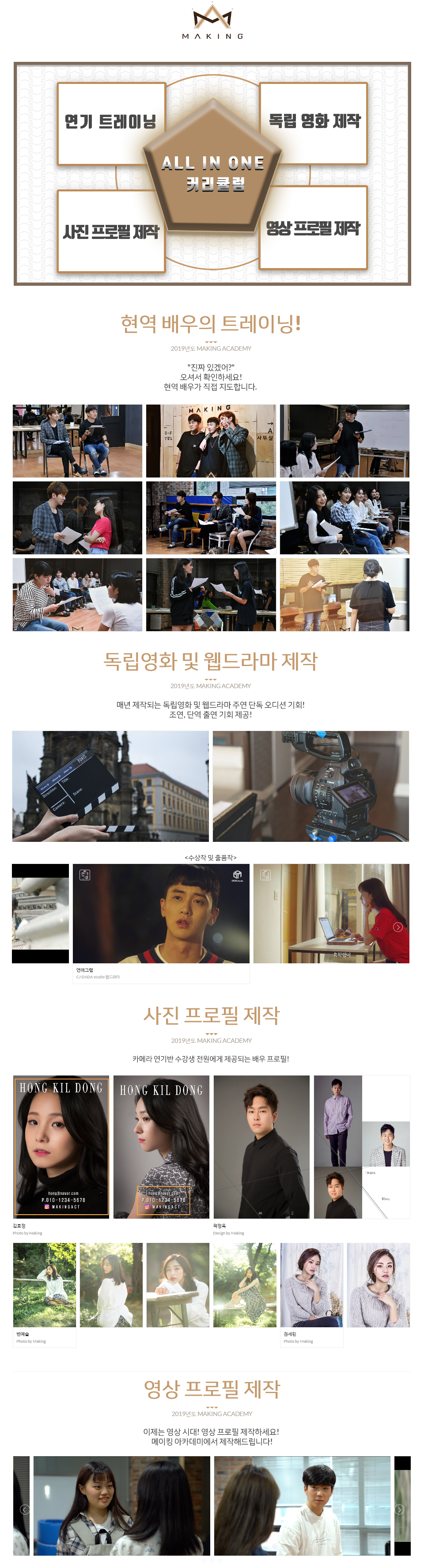 메이킹 아카데미는 현역 배우들과 현역 감독들이 직접 수업합니다. 연기 트레이닝부터 사진/ 영상 프로필까지 모두 배우와 감독들 의 노하우에 따라 제작을 돕고 있으며, 최종적으로 배우들과 함께하는 웹드 라마 또는 독립영화에 출연하게 됩니다.