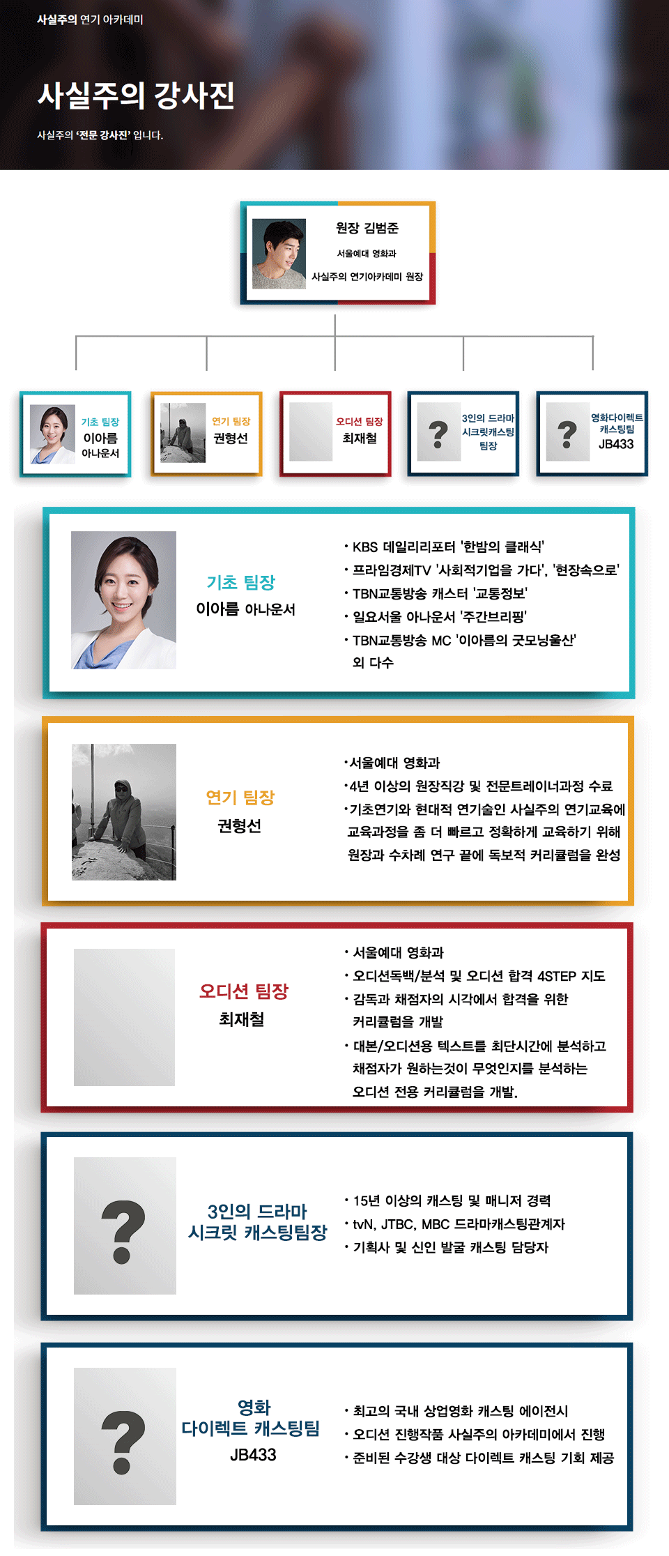 이뤄집니다. 학원생 대비 촬영 비율이 높은 캐스팅의 비결, 바로 사실주의만이 보유한 캐스팅 시스템 덕분입니다.
